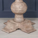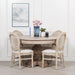Hand-crafted acacia wooden round 5 seater dining table in a rustic washed wood finish.
