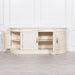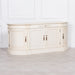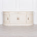 French classic large buffet sideboard handcrafted from mahogany wood in a distressed aged ivory finish with intricately detailed handles.