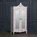 White painted double wardrobe in a French style with full length mirrored doors and intricate wooden hand carved detailing. The internal features includes hanging pole with 2 adjustable and removable shelves.